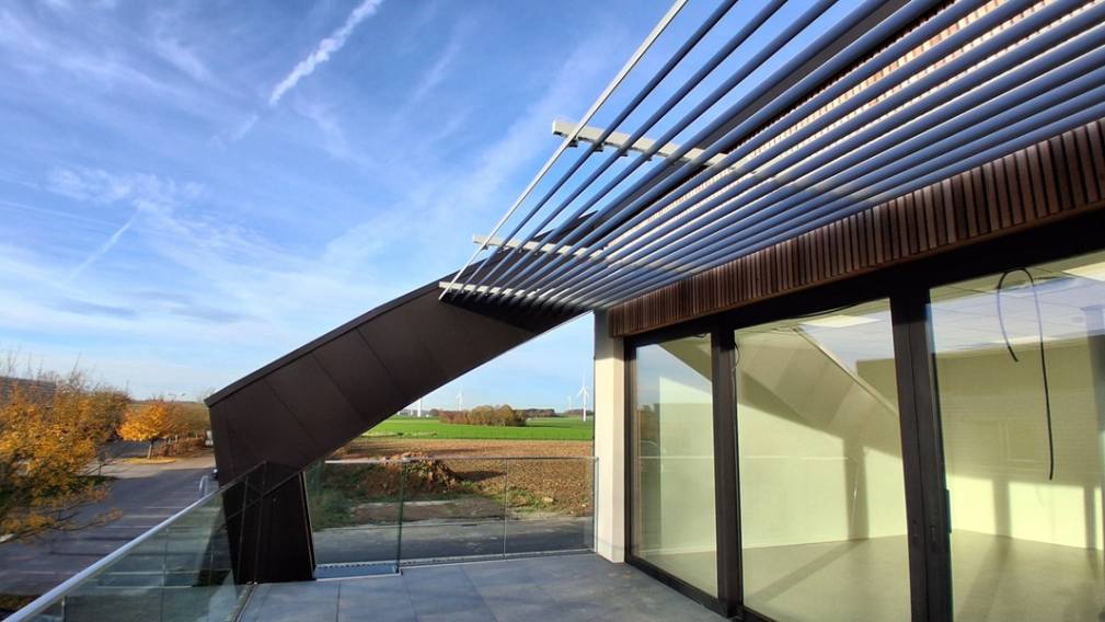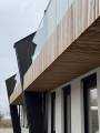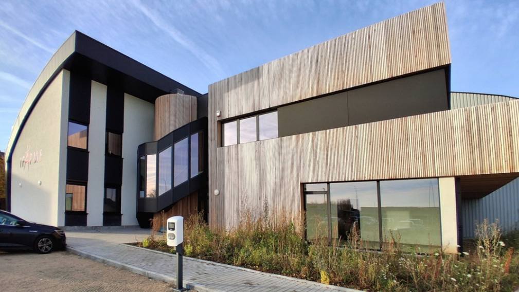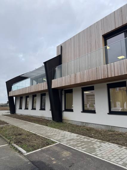 Cette optique de bâtiment vert a aussi guidé les choix esthétiques pour l’aspect extérieur du bâtiment : les matériaux de parement sont le bardage en bois ajouré vertical et le crépi pour l’avant du bâtiment, et le bardage métallique pour les fonctions plus techniques à l’arrière, de manière similaire au bâtiment existant. Le jeu de matériaux a été étudié sur toutes les façades pour permettre d’identifier les différentes fonctions en conservant une harmonie de l’ensemble.