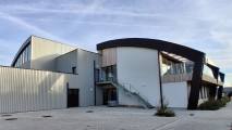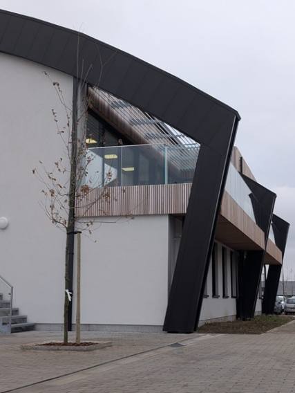 L’accès principal est clairement repéré par l’ensemble formé par l’escalier courbe qui s’enroule autour de la trémie d’ascenseur. Les parties courbes que l’on retrouve à l’entrée, mais surtout au niveau des toitures confèrent son identité à ce bâtiment et rappellent sa fonction. Ces courbes reprennent le langage formel de la grande ouverture présente en façade avant du bâtiment existant et de la toiture située à gauche de ce bâtiment, ce qui permet de conserver une cohérence d’ensemble tout en différenciant les nouvelles fonctions.